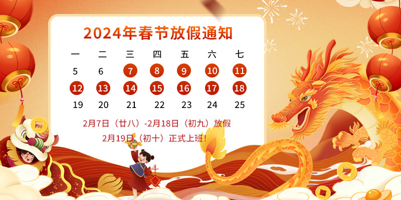 一、放假時間:2024年2月7日(農歷臘月廿八)----2024年2月18日(農歷正月初九)放假,2024年2月19日(農歷正月初十)正式上班。