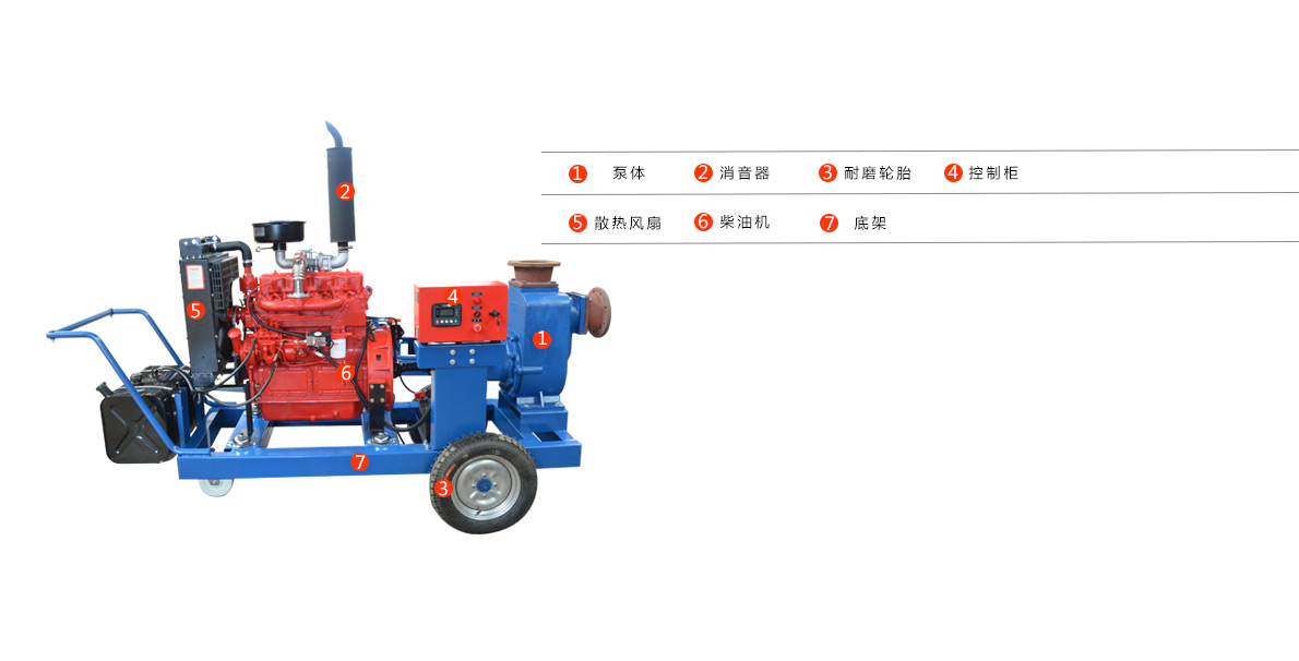 1.手推式強自吸移動泵車主要由真空輔助裝置、柴油機動力包、柴油機專用油箱、泵傳動系統、設備底座、自吸泵總成、防雨設施、起動裝置、起動電源裝置、進水管總成、出水管總成、二輪移動拖車系統、快速起吊裝置等組成。